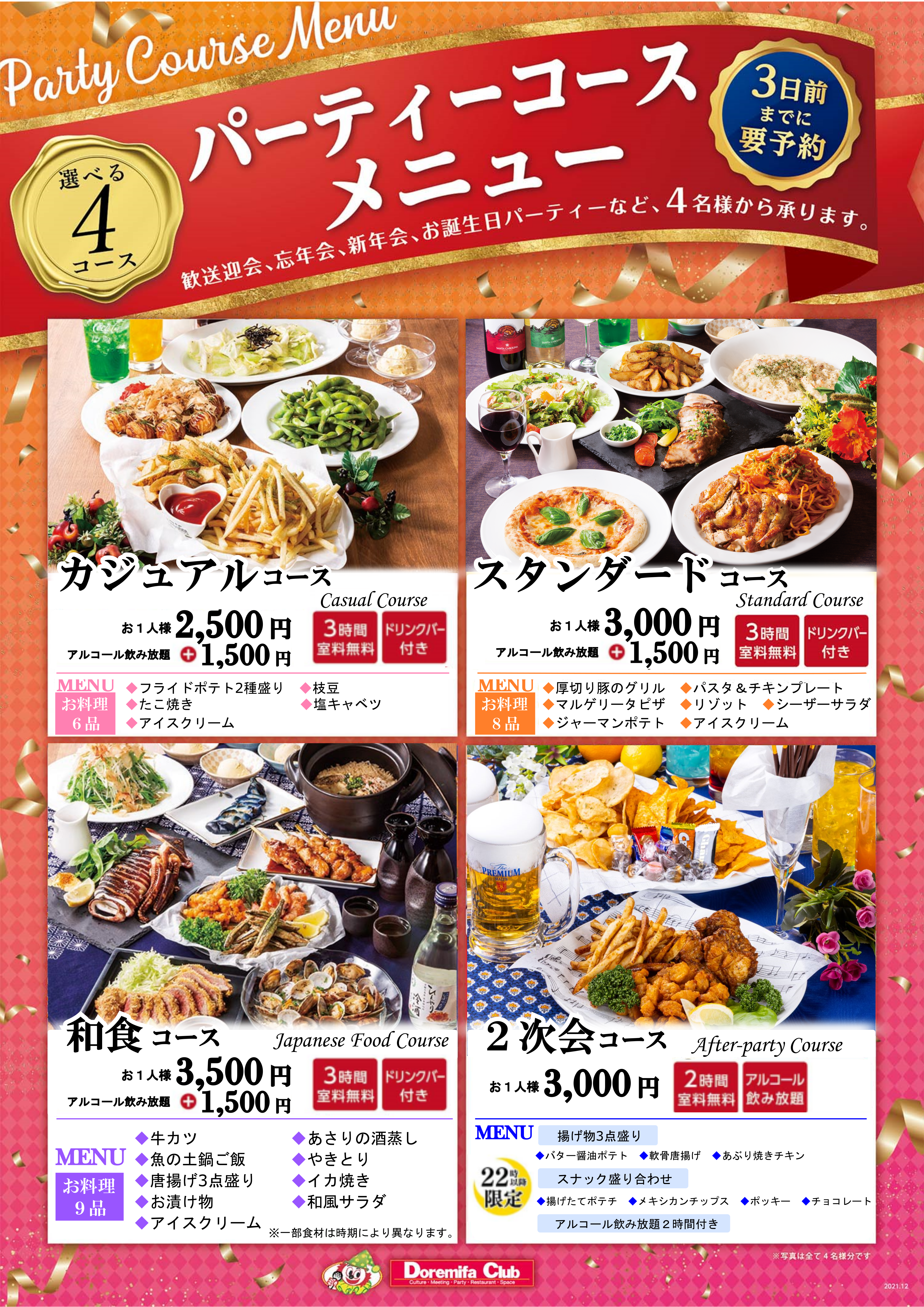 ※ご利用の曜日や時間帯により本パーティーメニューをご利用いただけない場合がございますので、ご利用の際は直接店舗までお問い合わせ下さい。