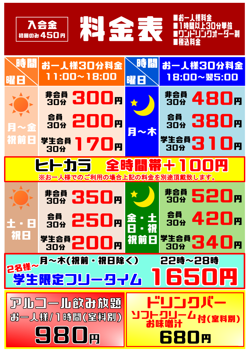 ・ドリンクバー500円(税込550円)室料別、時間無制限、お味噌汁・ソフトクリーム食べ放題