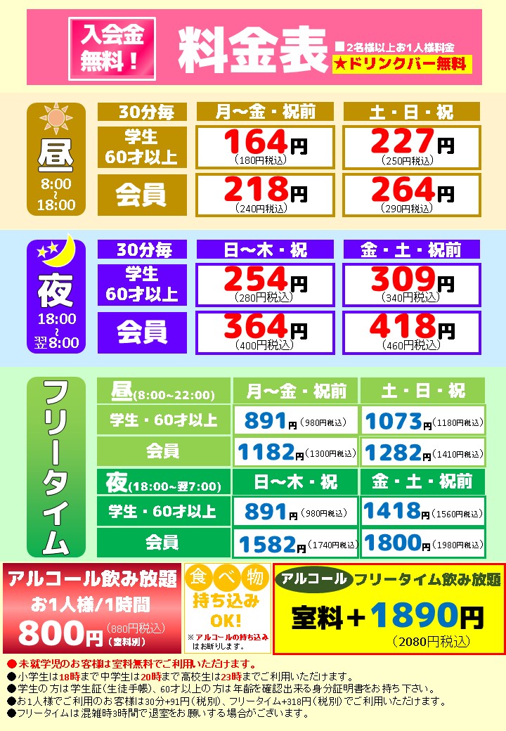 ※HPの更新状況により、HPに料金変更等が反映されていない場合もございますので、店舗をご利用いただく際には店舗に直接ご確認いただけますようお願いいたします。